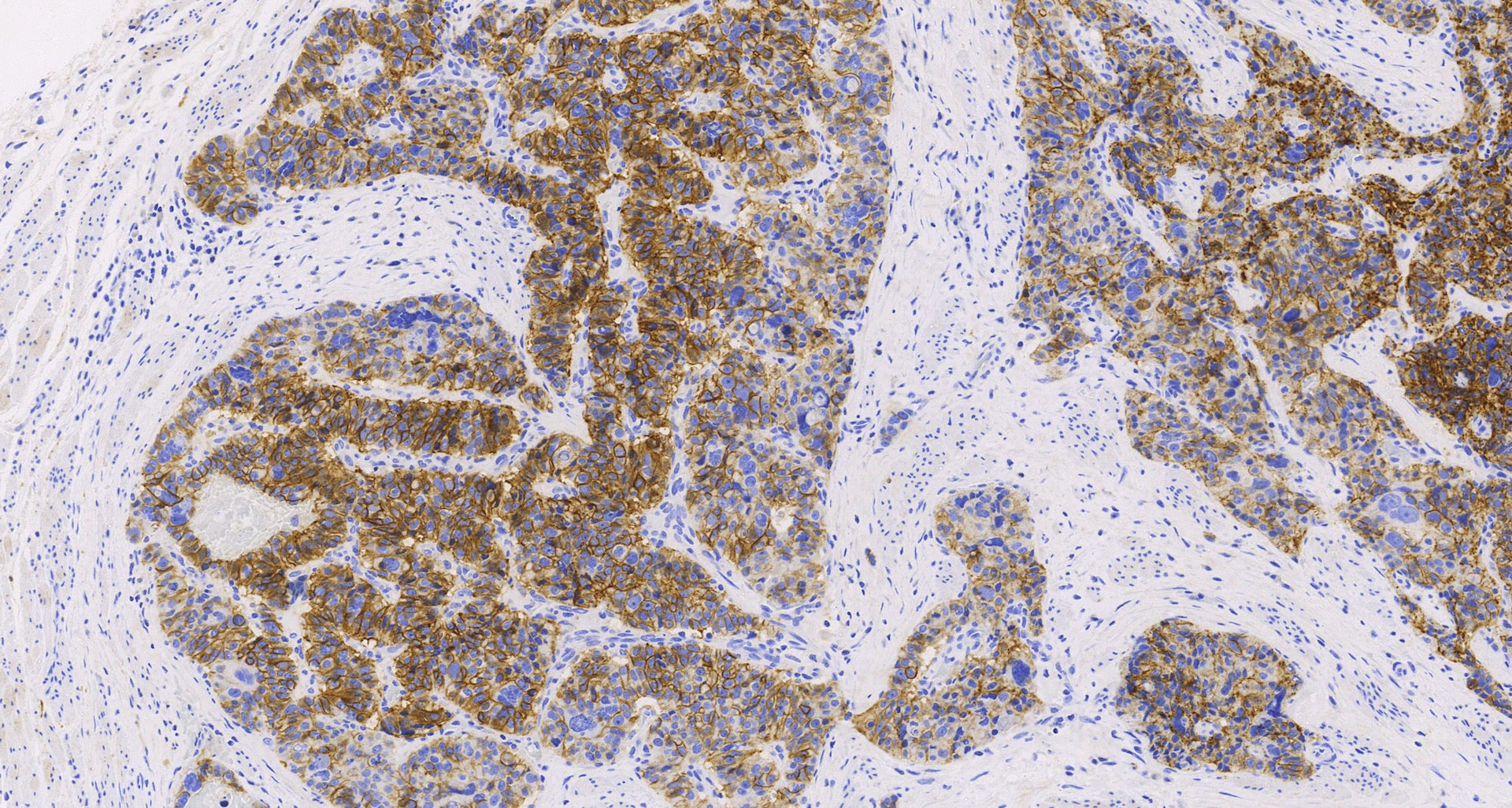 In normal cells, CD56 antibody staining is observed in natural killer (NK) cells, activated T-cells, brain and cerebellum tissues, and neuroendocrine tissues. Tumors that show positive staining for CD56 include Myeloma, Myeloid Leukemia, Neuroendocrine tumors, Wilm's Tumor, Adult Neuroblastoma, NK/T cell Lymphomas, Pancreatic Acinar-cell Carcinoma, Pheochromocytoma, and Small-cell Lung Carcinoma. Additionally, some mesodermally-derived tumors like Rhabdomyosarcoma express CD56. However, Ewing's Sarcoma/PNET is negative for CD56.